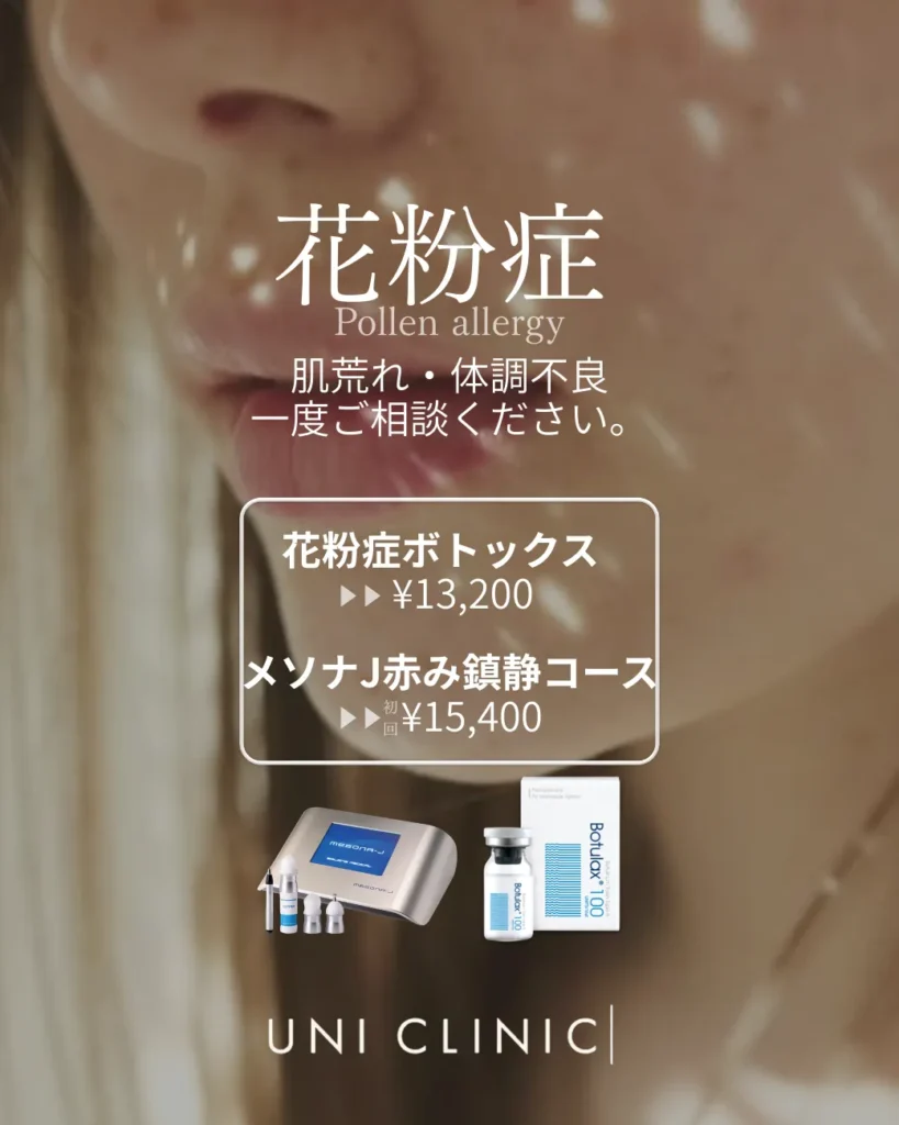 お知らせ 花粉症でお悩みの方へ☘️ 2026.03.04 花粉による肌荒れ、止まらない鼻水… 毎年UNI CLINICで人気の花粉症ボトックスはお薬を飲みたくない方にも大人気!お痛み無しになりますので、1シーズンに2〜3回の施術を推奨させていただいております。 安定人気のメソナJは、揺らぎやすい季節・赤みが気になる時にピッタリの鎮静効果の高いお施術になります。 【ご自身では何が合うかわからない】そんな時は一度、ご相談ください♪